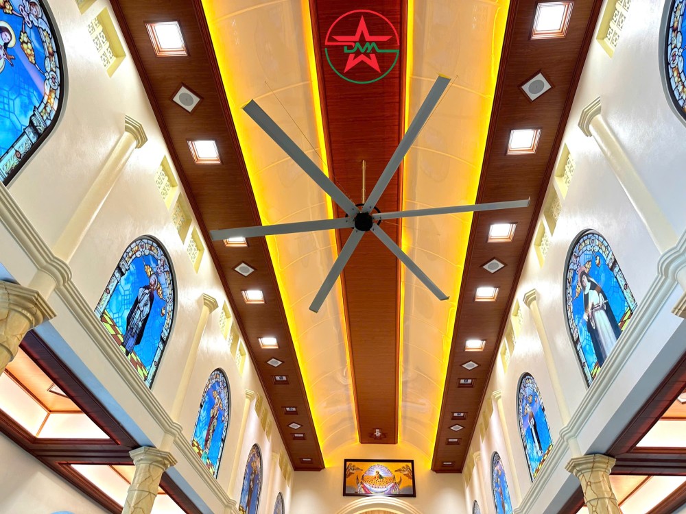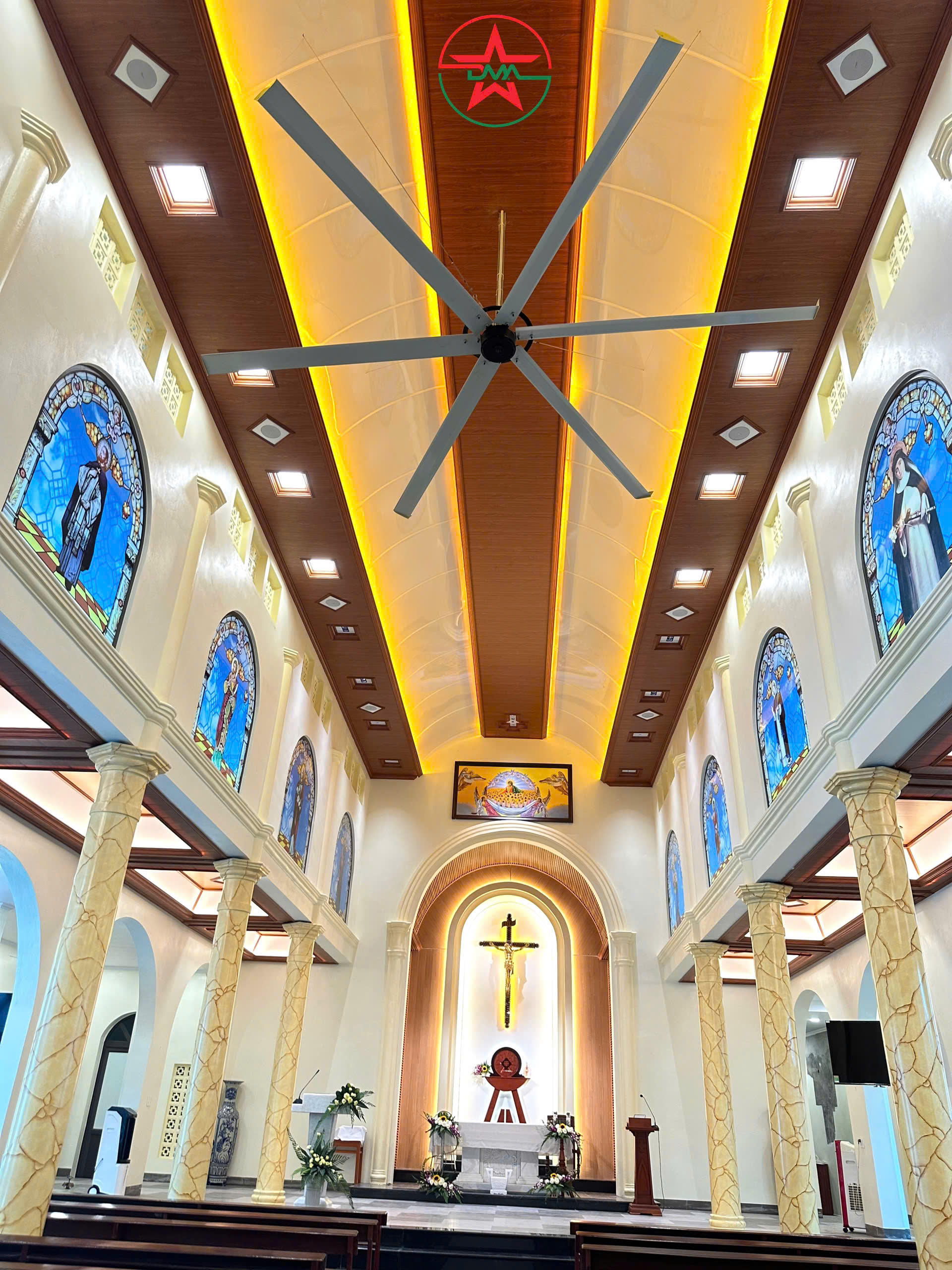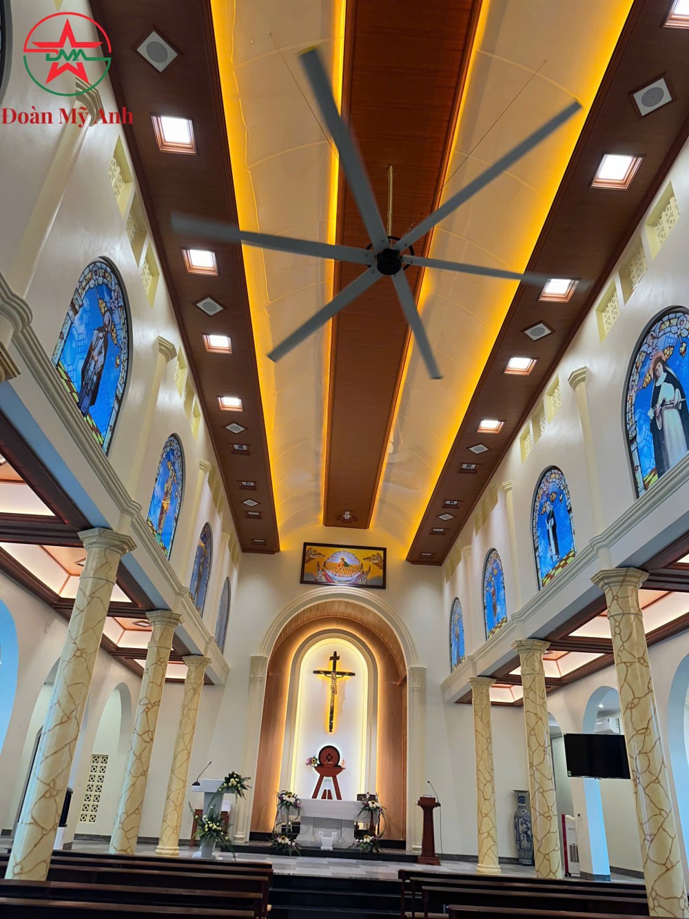 Sau khi khảo sát thực tế, đội ngũ kỹ thuật Đoàn Mỹ Anh đã đề xuất giải pháp lắp đặt quạt trần công nghiệp ĐMA với thiết kế cánh lớn, lưu lượng gió mạnh và êm ái, phù hợp hoàn hảo với không gian kiến trúc cao rộng của nhà thờ.