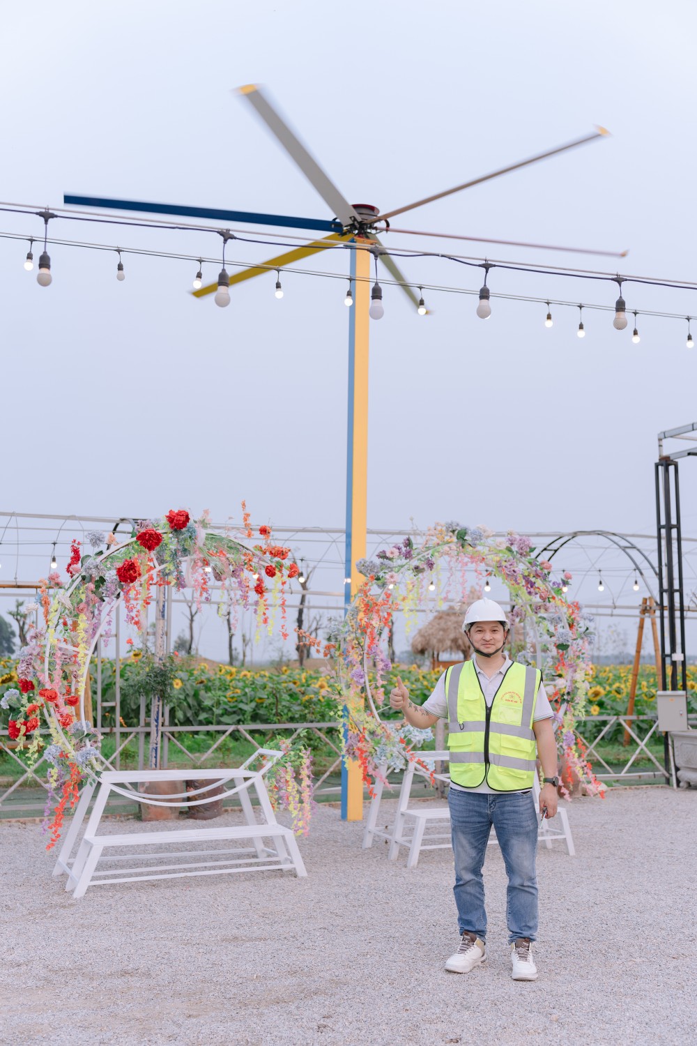 Với đường kính sải cánh 5,5 mét, quạt tạo ra luồng gió lưu thông mạnh mẽ và ổn định, bao phủ không gian lên tới 900 m², giúp giảm nhiệt độ môi trường 5–8°C, giảm ẩm và mùi hôi, đồng thời tiết kiệm 40–60% điện năng so với hệ thống quạt công nghiệp truyền thống.